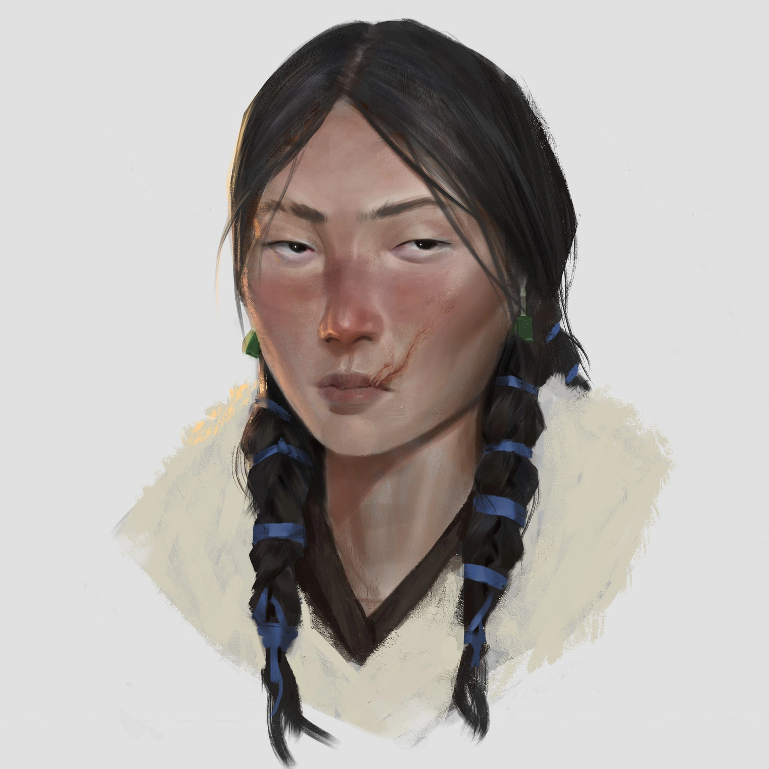 Appearance: Medium build, light skinned, long black hair, black facial hair, red military attire, & no gloves.