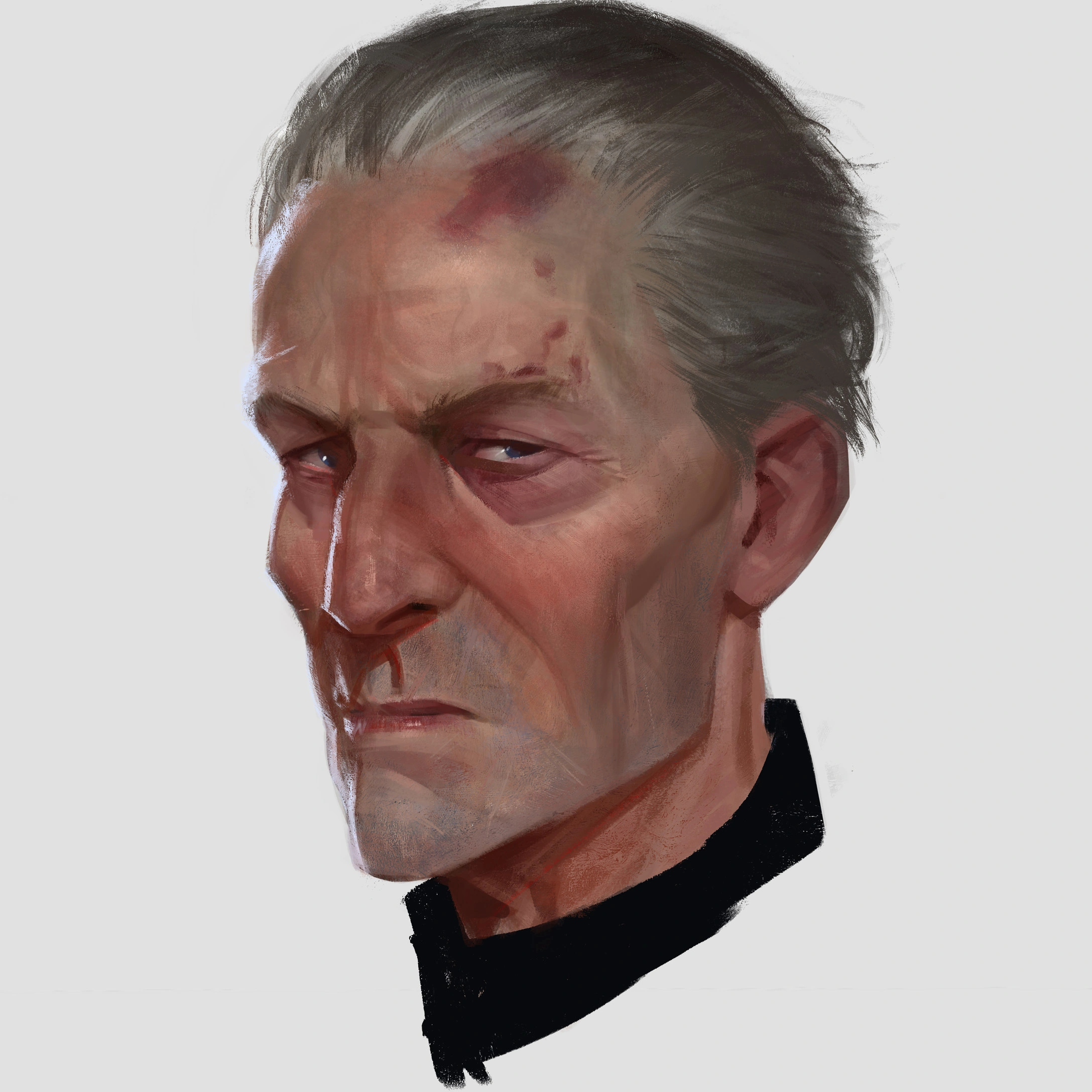 Appearance: Light build, light skinned, short white hair, white facial hair,