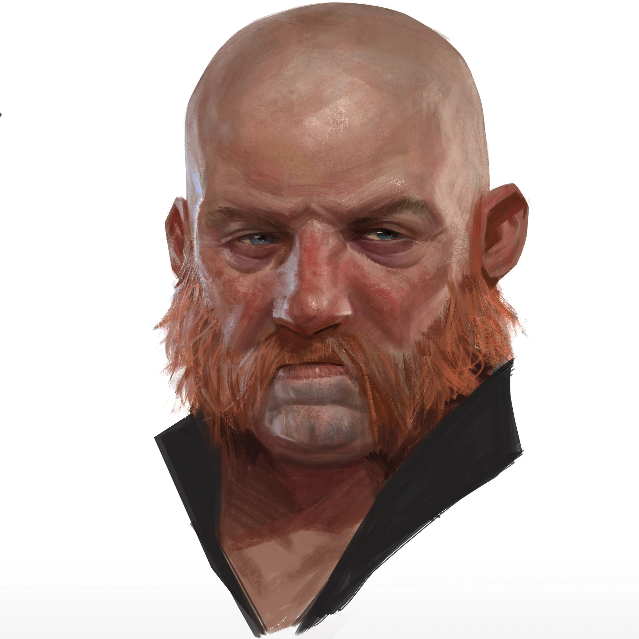 Appearance: Medium build, light skinned, no hair, red facial hair, blue clothing, & black gloves.